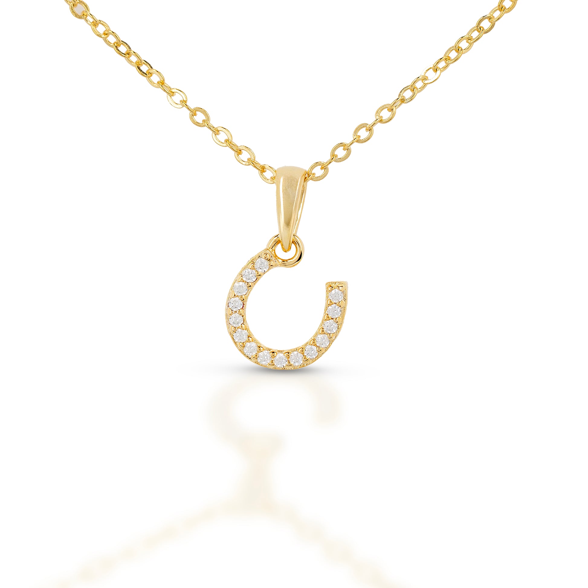 This delicate pendant necklace features a classic horseshoe design adorned with sparkling clear stones. Finished in a warm gold tone, the curved silhouette and pavé-style detailing create a refined balance of elegance and symbolic charm.
