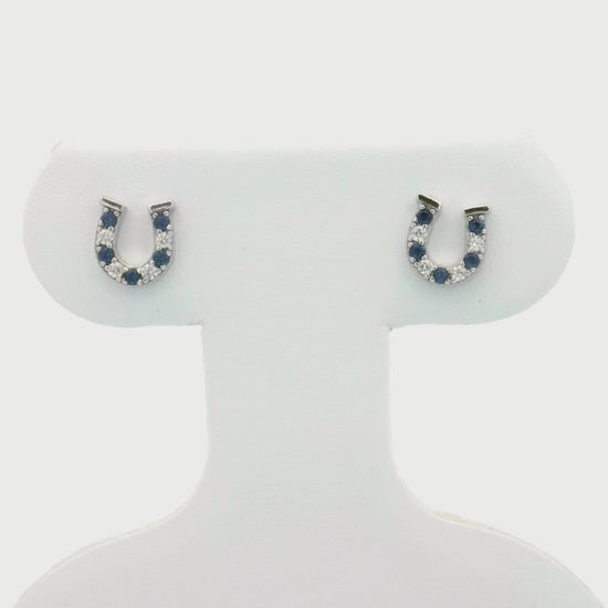 Kelly Herd Blue & Clear Horseshoe Earrings are delicate sterling silver horseshoes enhanced with blue and clear CZ stones. Perfect for taking a little luck into the ring with you!