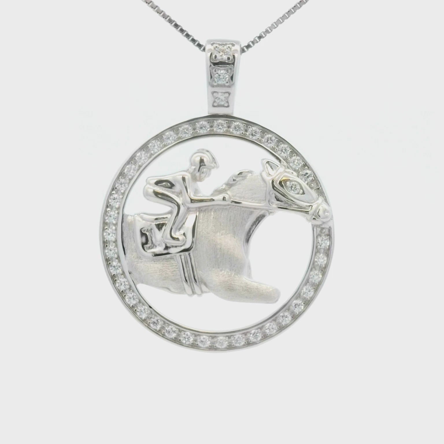 The Kelly Herd Circle Race Horse Pendant is a beautiful representation of the Sport of Kings! A horse and jockey at burst from a circle of clear CZ stones. Sterling Silver. Adjustable 16-18" chain.