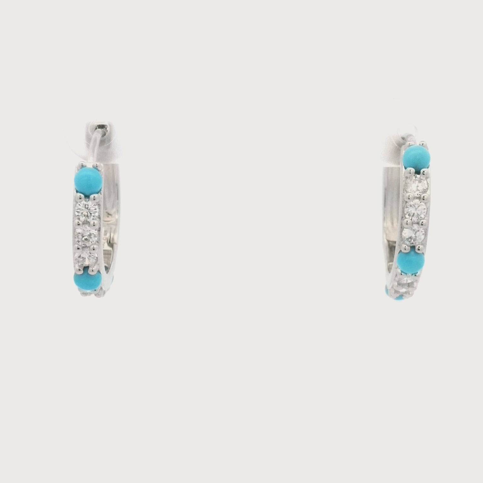 Enhance your style with these beautiful hoop earrings. Featuring 6 round 3mm cubic zirconia stones and 3 vibrant 4mm cabochon sleeping beauty stones, these earrings would pair perfectly with a casual jeans or an elegant dress. With their size of 3/4 of an inch and bold color making them a versatile and captivating addition to any wardrobe.