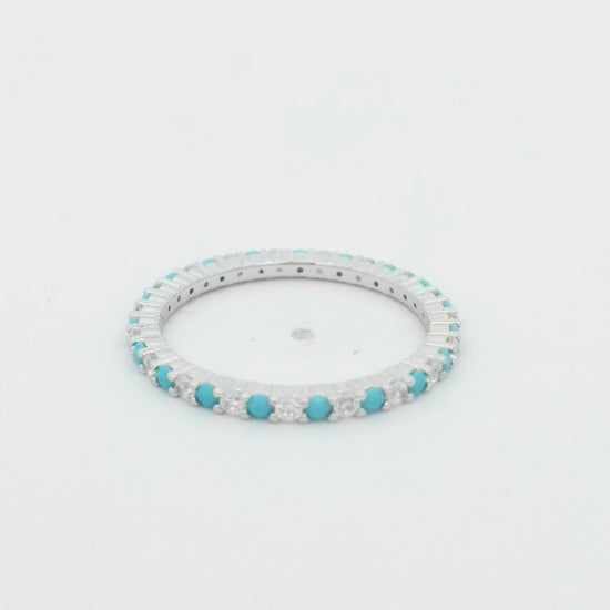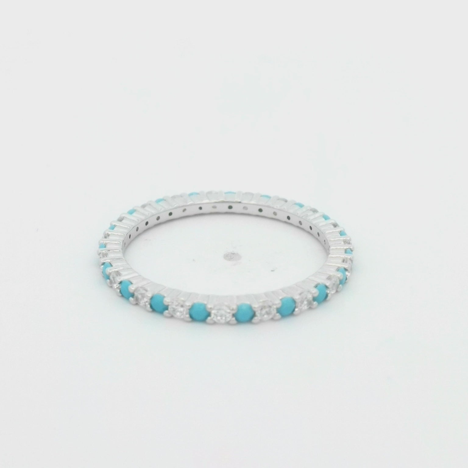 Add a touch of elegance to your jewelry collection with this stunning ladies' sterling silver anniversary band. Adorned with 37 1mm round turquoise and clear stones, this ring offers a delicate yet vibrant aesthetic. Designed for versatility, it can be worn as a thumb ring or as a wedding band, making it perfect for everyday wear.