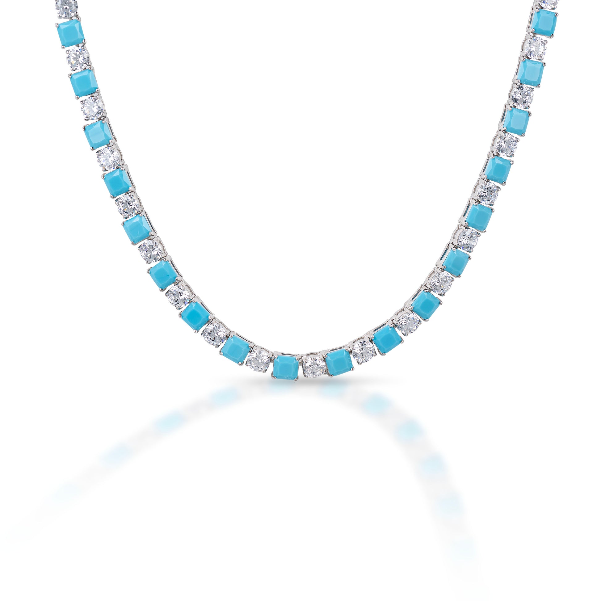 Make a bold statement with this exquisite handcrafted necklace, a true masterpiece in sterling silver. Adorned with 33 cushion-cut turquoise stones and 32 round clear cubic zirconia accents, this necklace is designed to captivate. Perfect for pairing with an open blouse or neckline, it draws admiration and compliments from everyone who sees it.