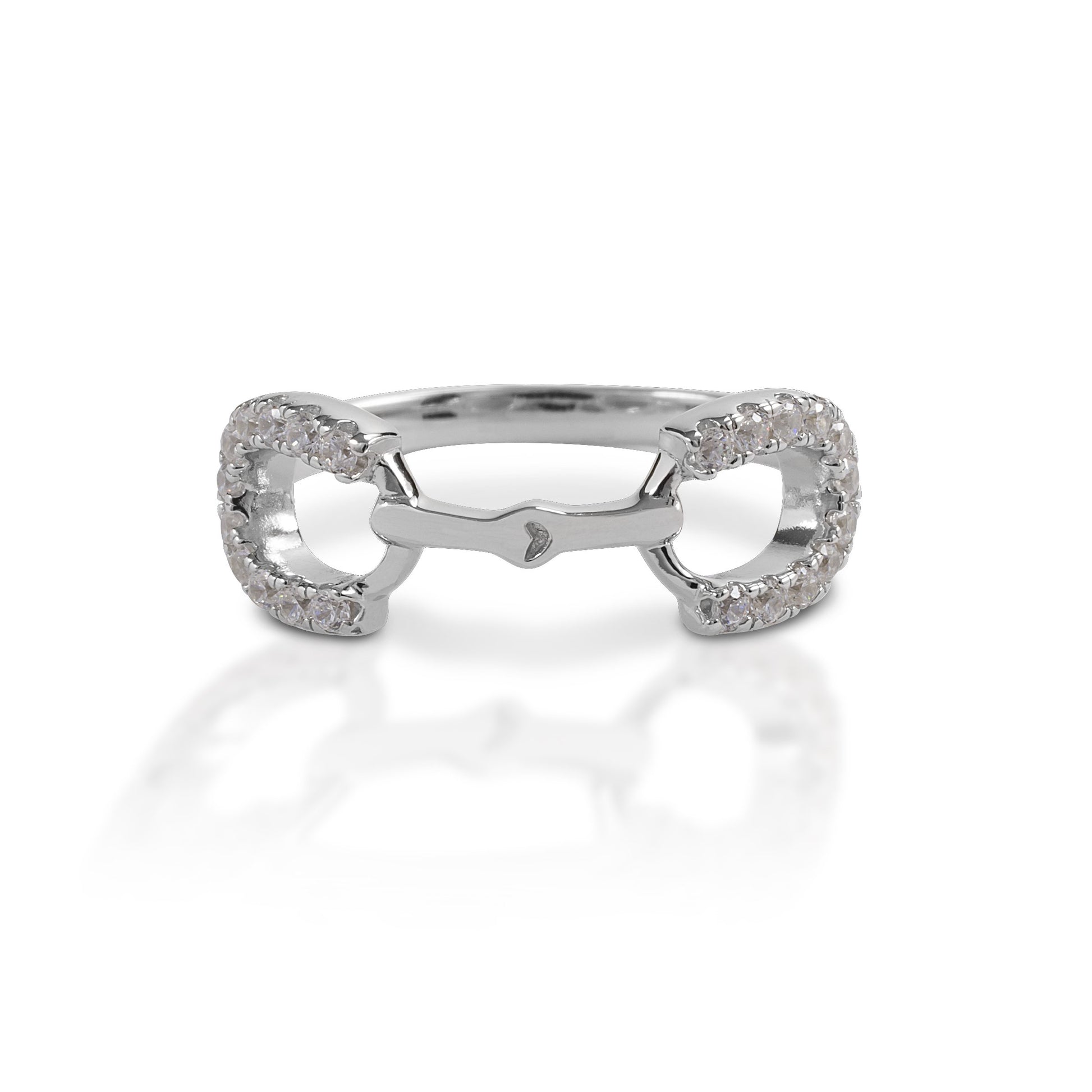 The Kelly Herd Clear Stone Horseshoe Bit Ring is made of sterling silver featuring a snaffle bit design with clear CZ enhanced horseshoes as the bit rings.