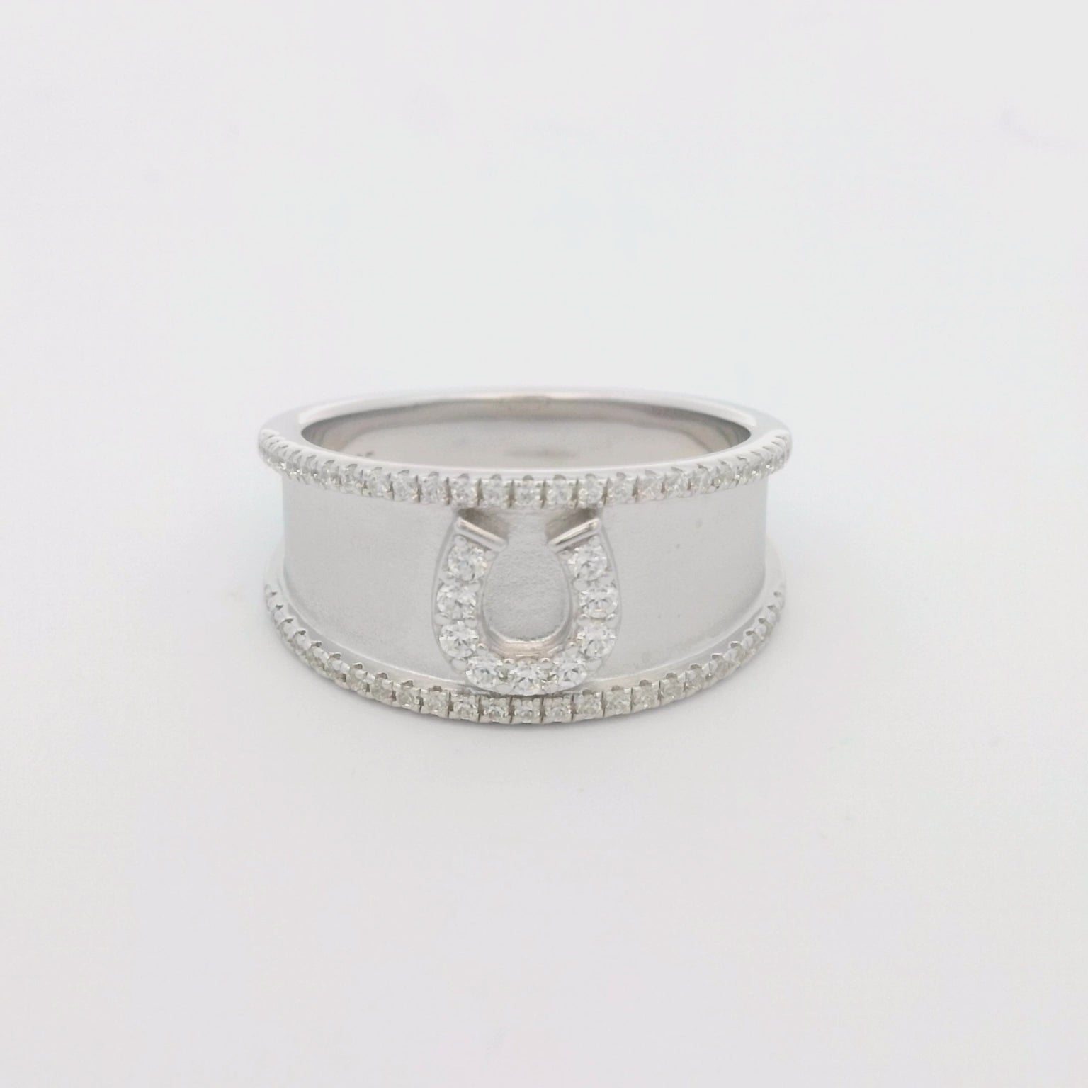 The Kelly Herd Crystal Bordered Horseshoe Ring features a 9mm wide band of brushed sterling silver with a raised edge accented with cubic zirconia.   In the center sits a perfectly formed tiny horseshoe with pave cubic zirconia stones.  This is a bold, solid looking ring, yet the addition of the sparkly edge gives it a feminine touch. This ring is perfect for people who actually ride; no large single stones to catch on every piece of tack!