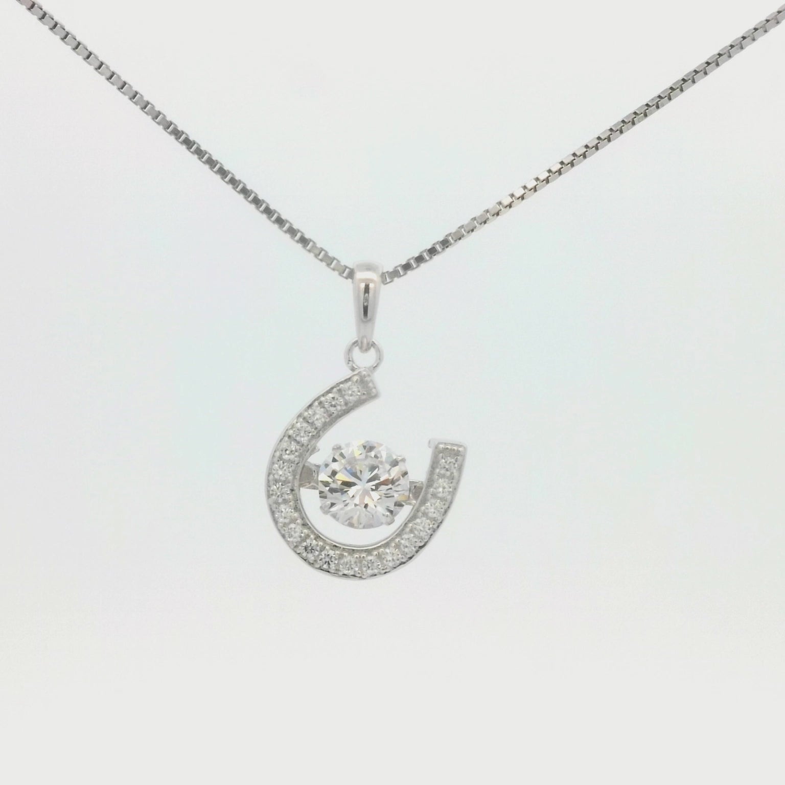Kelly Herd Dancing Stone Horseshoe Dangle Necklace will sparkle with your every move. This sterling silver and CZ pendant is all about movement and light. The center round CZ stone turns to add a three dimensional element. Comes with a 16"-18" adjustable chain. Matching dangle earrings are available.