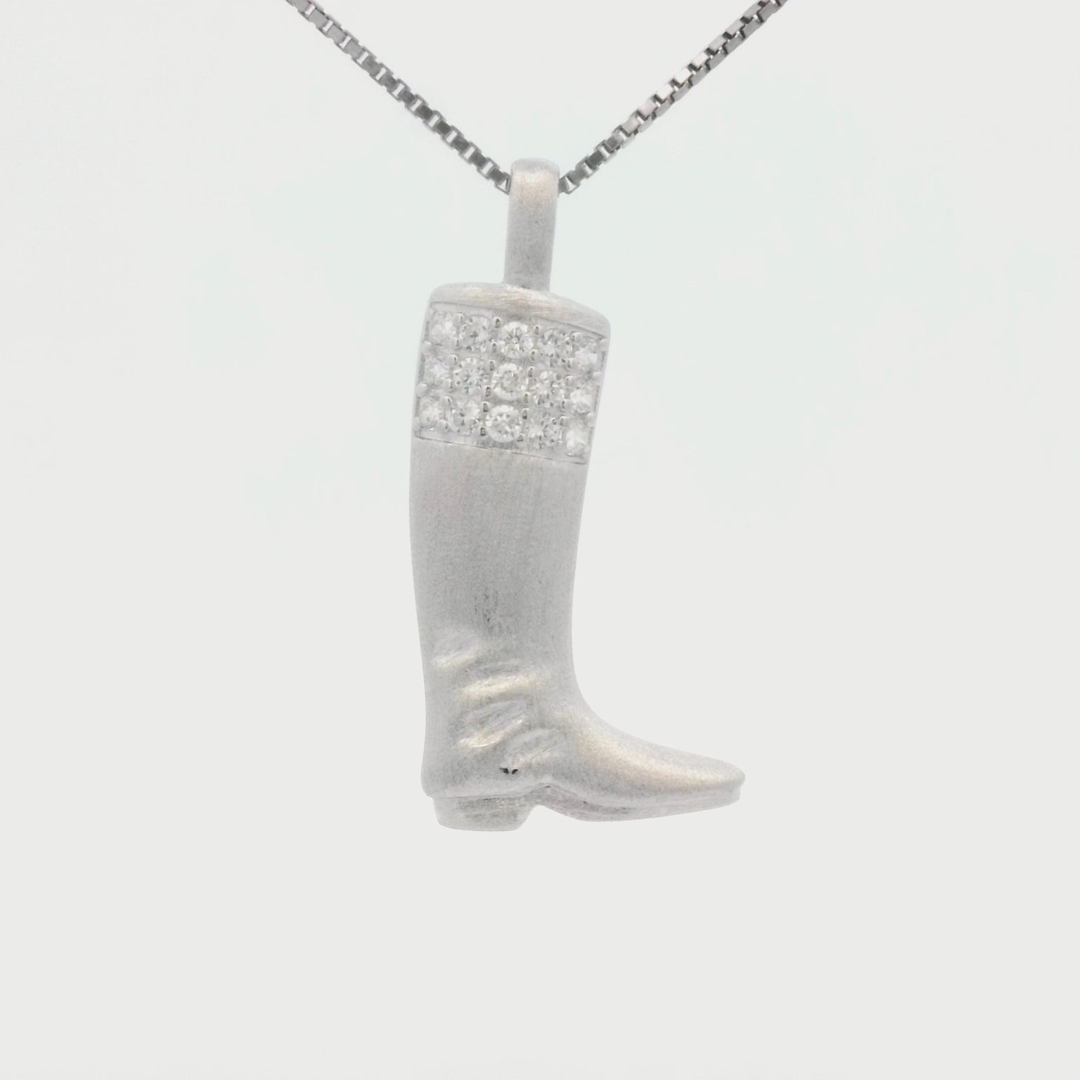 The Kelly Herd English Boot Necklace features a traditional style English boot made of brushed sterling silver and enhanced with CZ. It brings to mind fox hunts, and jockeys and cavalry officers. Comes with a 16"-18" adjustable chain.