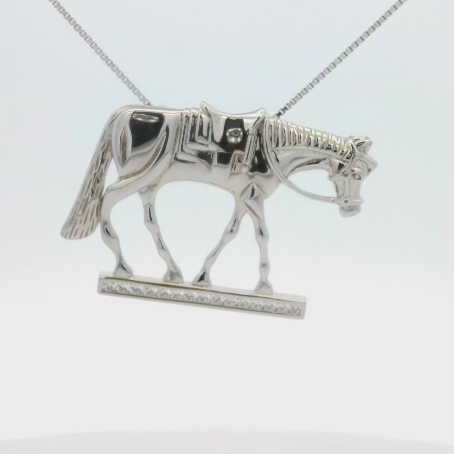 This pendant necklace is the perfect piece to show your love for horses, whether it be just a leisurely canter around the ring--this necklace shows where your true passions lie. The detailing is exquisite, and with stylish stones it adds just the right amount of sparkle.