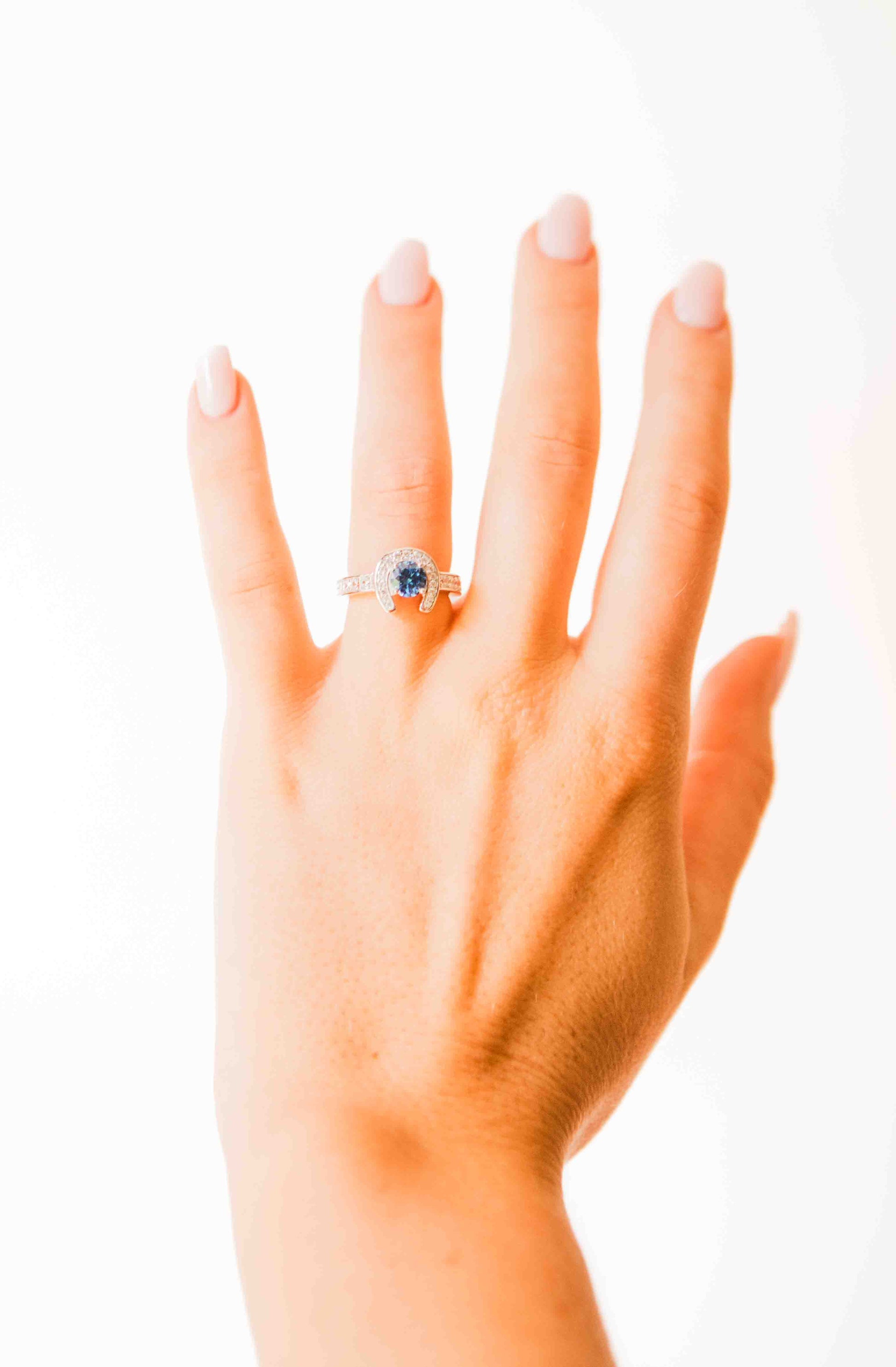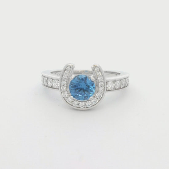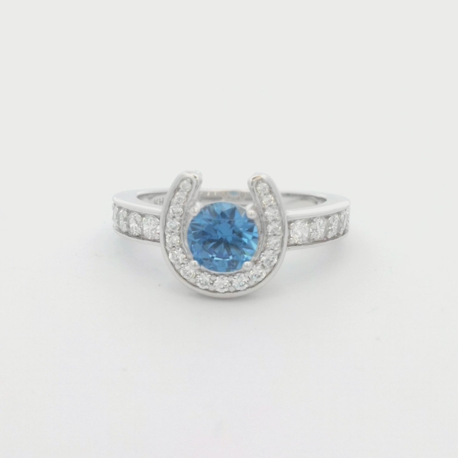 A contemporary horseshoe ring set with cubic zirconia stones in the band and horseshoe and enhanced with a synthetic ceylon sapphire! The Kelly Herd Kiley Contemporary Horseshoe Ring features a band of sterling silver with 10 inset cubic zirconia clear stones. The horseshoe has 17 inset CZ stones. In the center of the horseshoe sits a lovely Ceylon Sapphire.