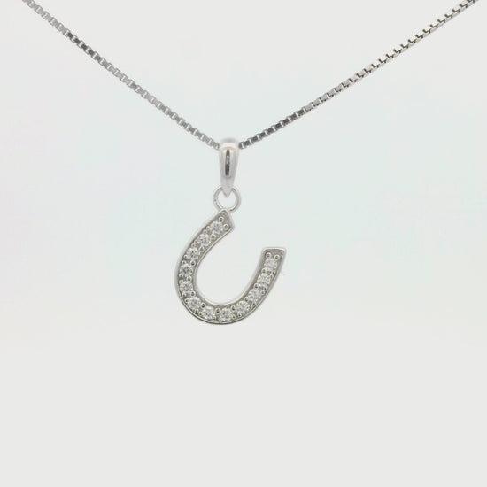 The Kelly Herd Large Clear Dangle Horseshoe Necklace features a beautiful offset sterling silver horseshoe design enhanced with clear cubic zirconia stones. This is the larger version of one of our best selling pendants. It's perfect for taking a little luck into the ring with you. Comes with a 16" - 18" adjustable box chain.
