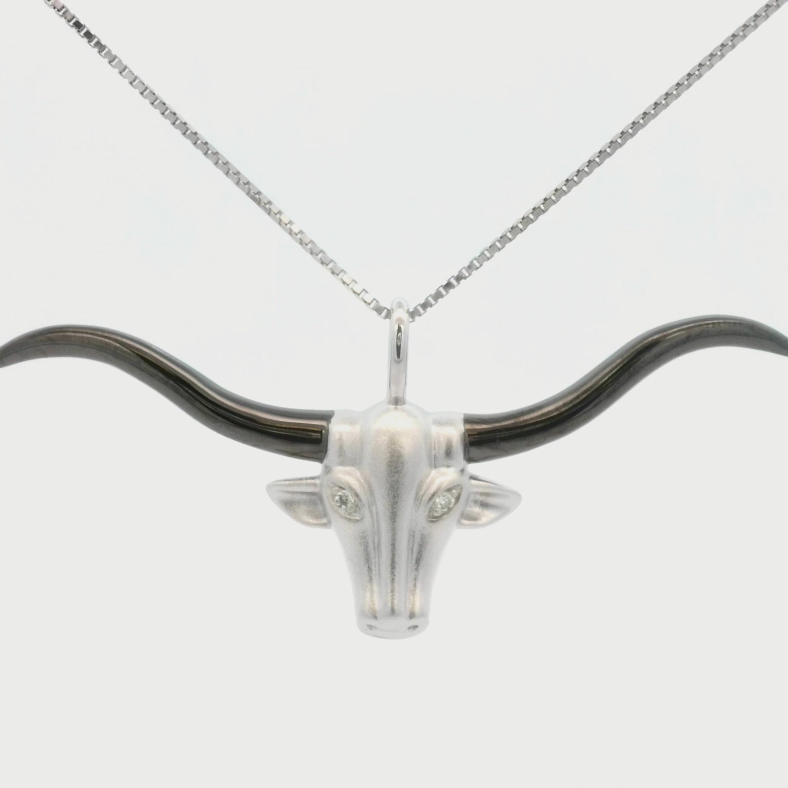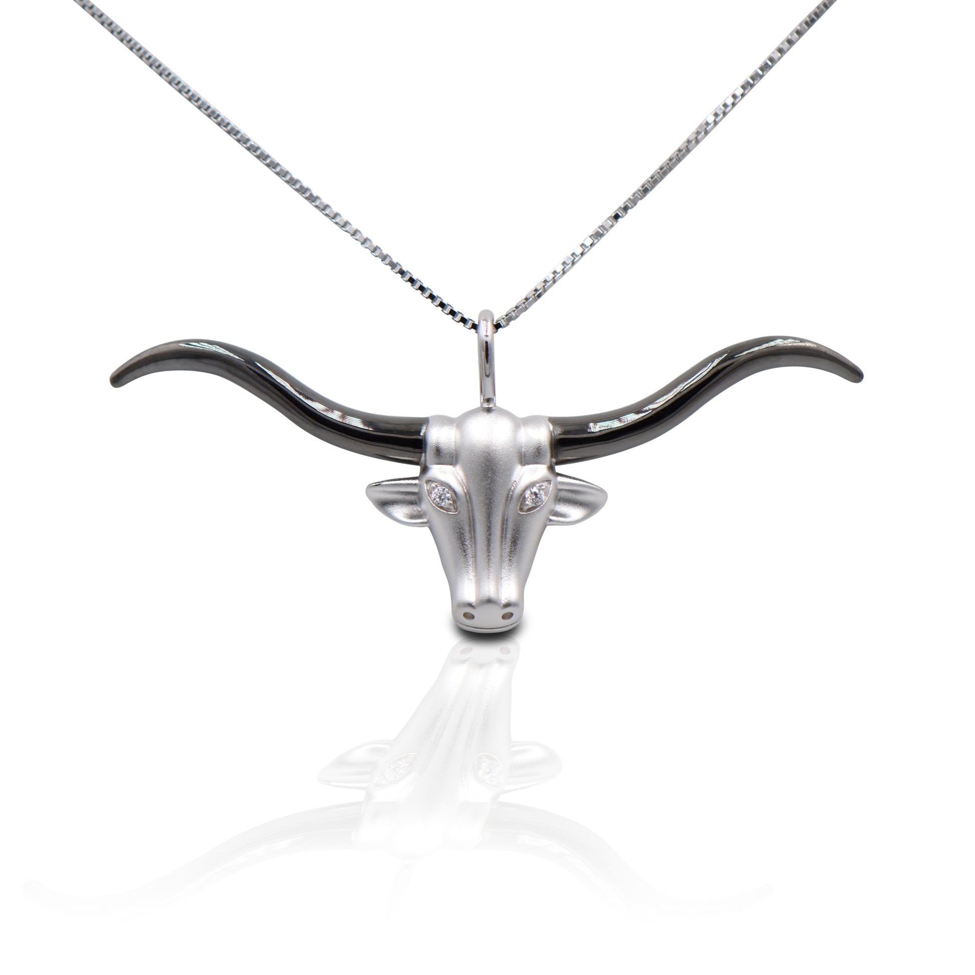 Hook 'Em Horns! The Kelly Herd Large Longhorn Necklace features an incredibly detailed long horn head with a brushed surface and shiny black horns. Made of sterling silver, with clear CZ "eyes" . Comes with adjustable 16-18" chain.