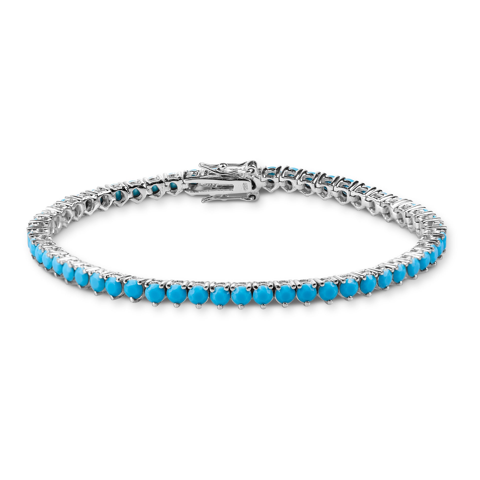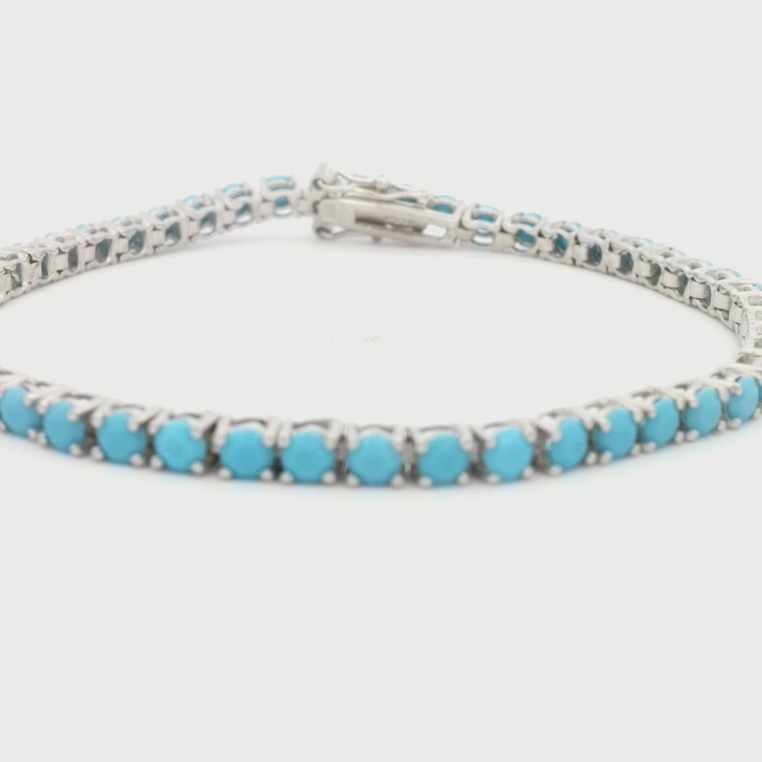 Add a pop of color and elegance to your jewelry collection with this stunning turquoise bracelet. Featuring 57 vibrant 3mm round turquoise stones, this bracelet offers a rich, natural aesthetic that is both eye-catching and sophisticated. With a length of 7 inches, it sits comfortably around the wrist, making it a perfect choice for layering or as a standalone piece.