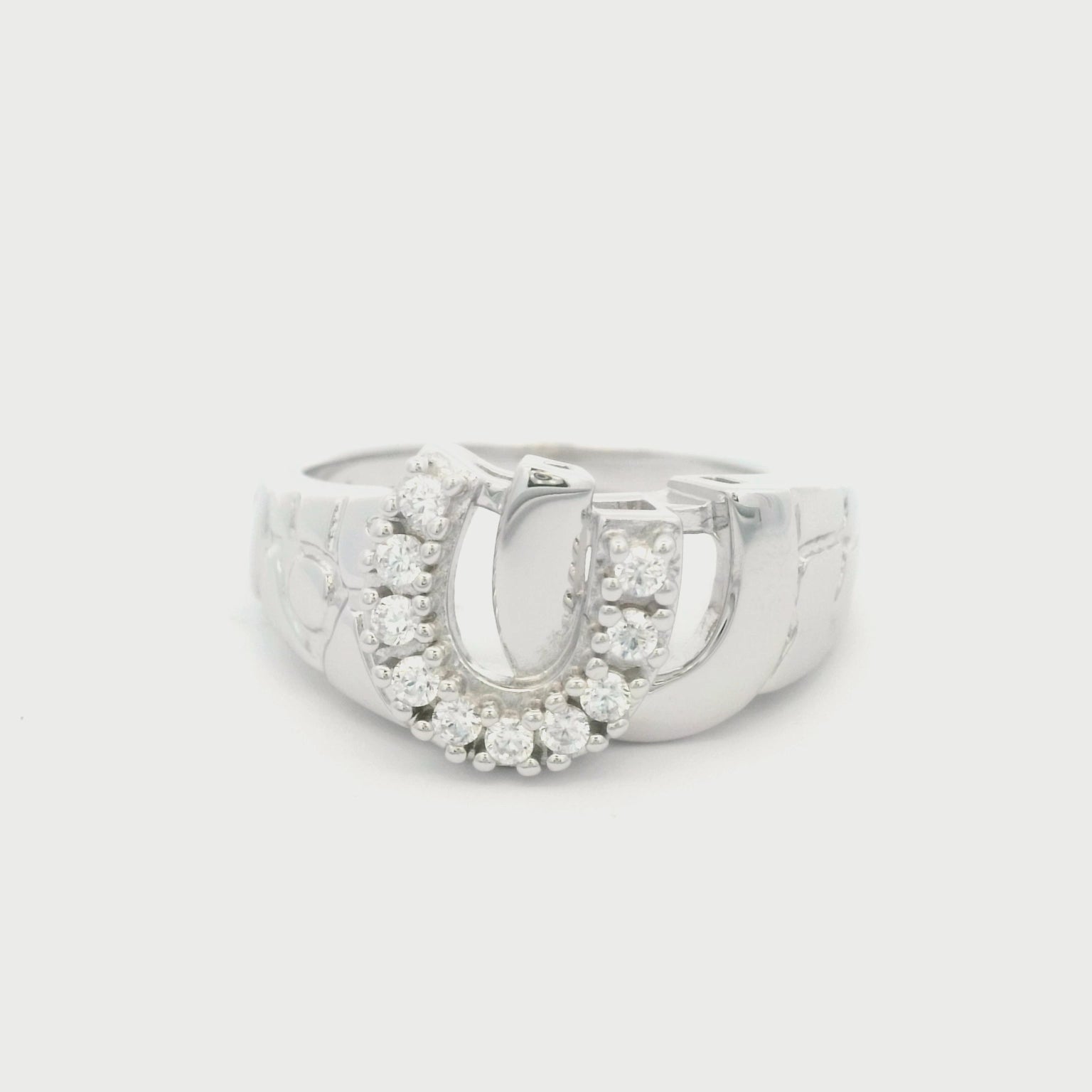 Bright, eye catching and yet still masculine, the Kelly Herd Men's Double Horseshoe Ring is a great way to give a little luck to your favorite cowboy! This ring has a wide textured band and two open topped horseshoes - one enhanced with CZ stone and the other smooth and glossy. Sterling Silver.
