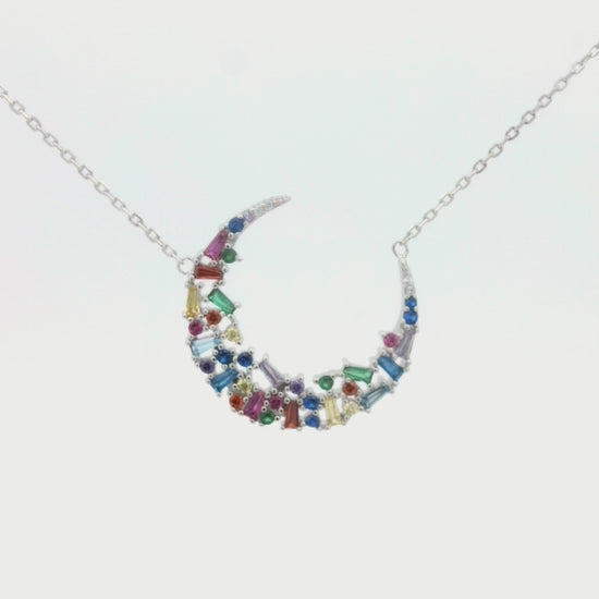 The Kelly Herd Multi-Color Crescent Necklace is simply stunning. The baguette cut rainbow colored cubic zirconia stones are set in a sterling silver crescent moon shape. This necklace features a 16"-18" adjustable chain, making this perfect for any outfit.