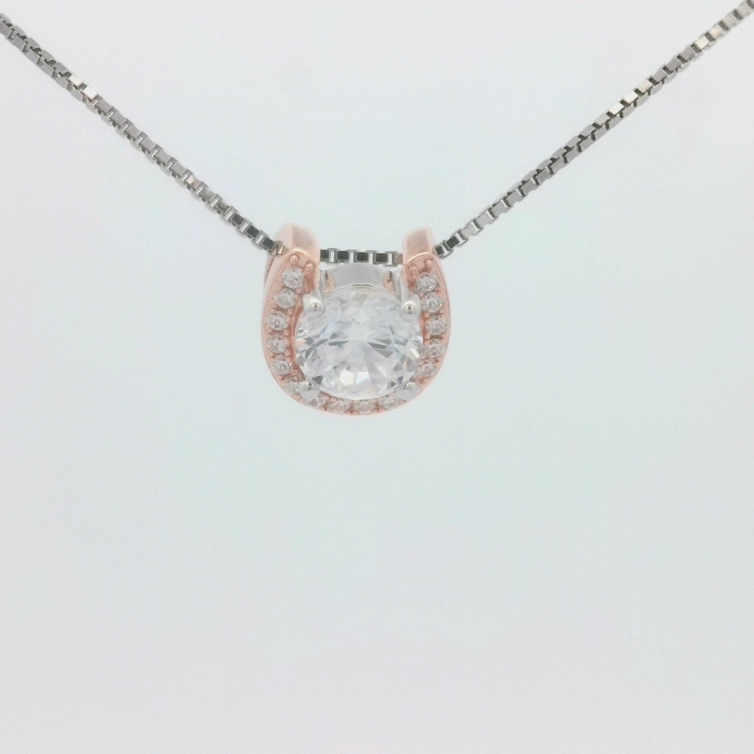 A classically styled pendant with an equestrian touch! The Kelly Herd Rose Gold Plated Horseshoe Necklace was designed to compliment the best selling Kelly Herd Rose Gold Plated Horseshoe series. The center silhouette stone in this pendant is surrounded by a rose gold plated horseshoe that is enhanced with smaller clear cubic zirconia stones. This necklace pairs perfectly with any piece from the Rose Gold Horseshoe Collection.ÂÂ