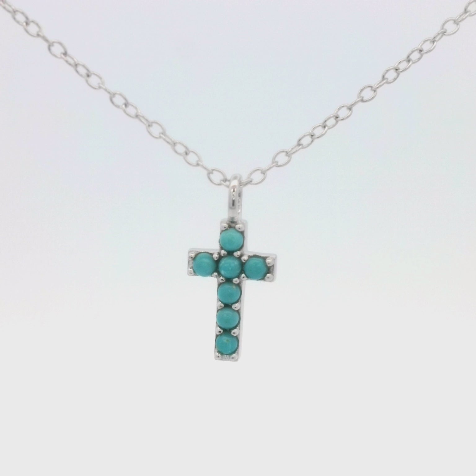 Add a touch of timeless elegance to your collection with this beautifully crafted cross necklace. Featuring a sterling silver cross, measuring 12mm wide by 8mm tall, adorned with 7 round 1mm cabochon turquoise stones, this piece captures the essence of classic beauty and vibrant color. The adjustable chain offers a versatile fit, ranging from 17 to 19 inches, ensuring it’s perfect for any occasion.