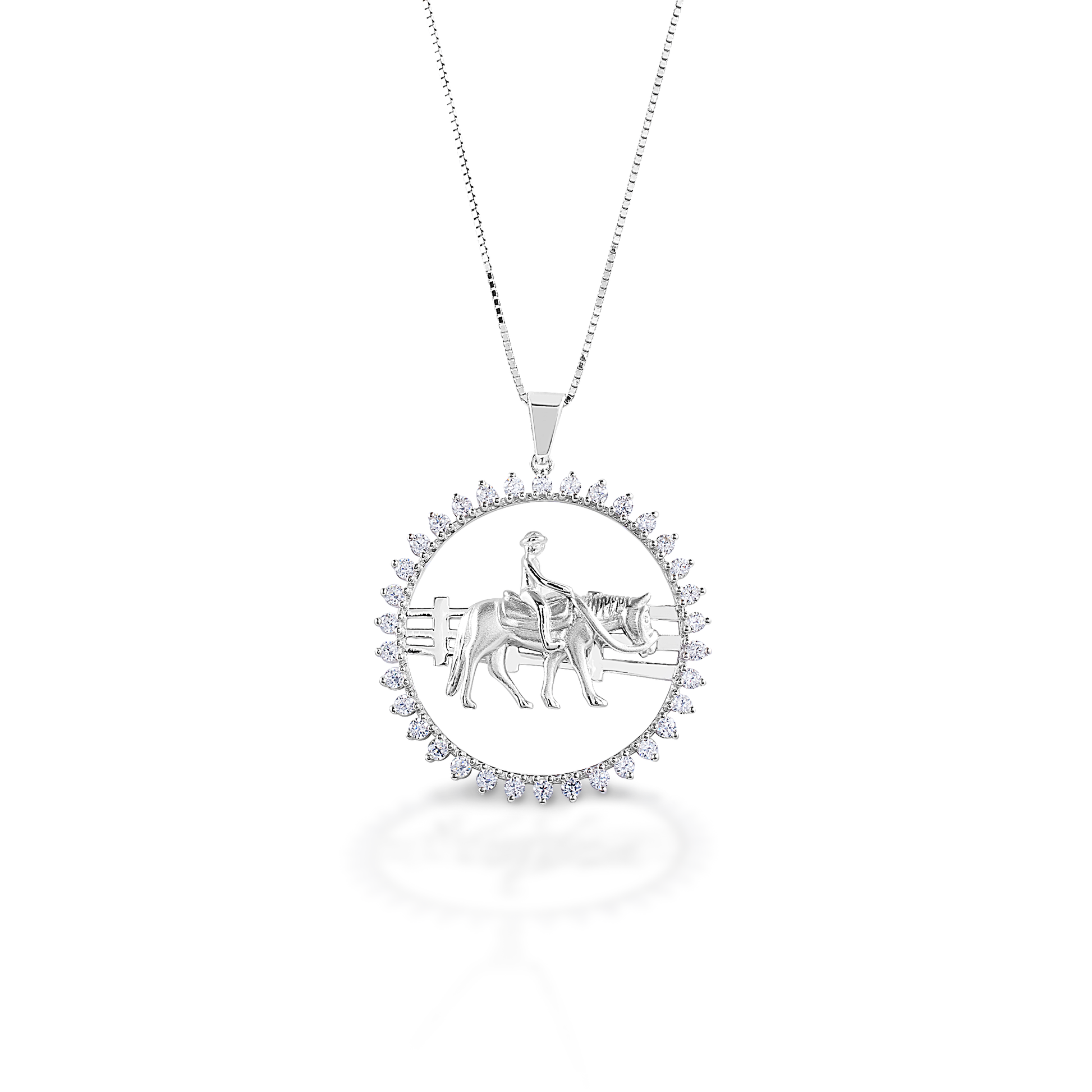Kelly Herd's Ranch Horse Pendant captures the quieter moments of ranch and farm live. Crafted in sterling silver, and enhanced with CZ stones. Comes with 16-18" adjustable chain.