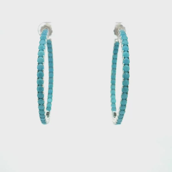 Elevate your style with these stunning sterling silver hoop earrings, designed to impress and delight. Featuring 40 vibrant 3mm turquoise stones, these earrings are a striking accessory that pairs perfectly with both casual jeans and elegant dresses. Their generous 1¾ inch size adds a bold touch, making them a must-have for any jewelry collection.
